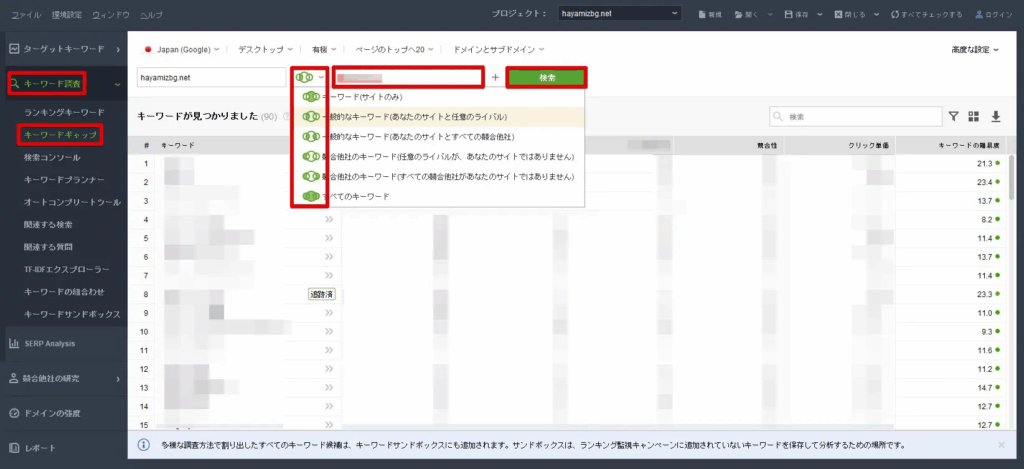 「キーワード調査」「キーワードギャップ」をクリックします。