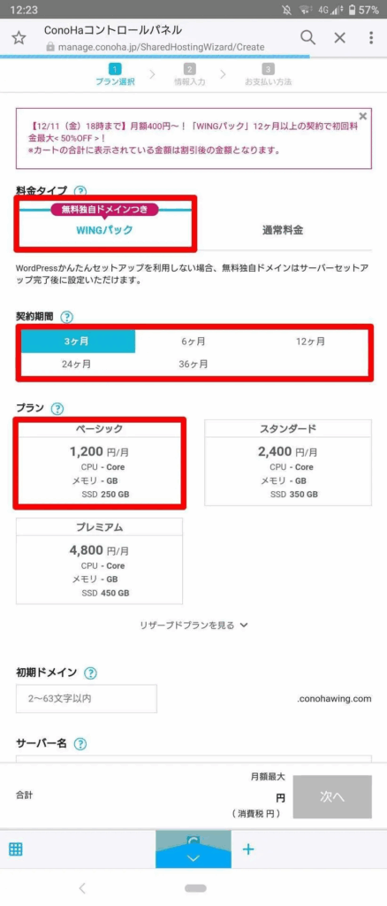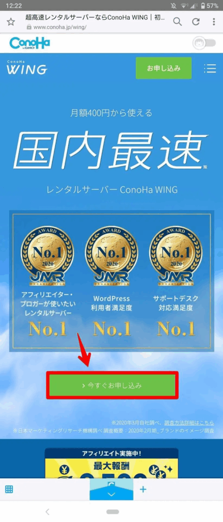 まずはConoHa WING公式サイトの申し込みページへ入ります。