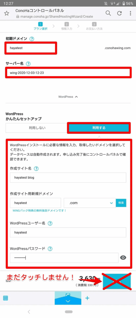 初期ドメイン(独自ドメインとは違います)、サーバー名・WordPressかんたんセットアップを入力