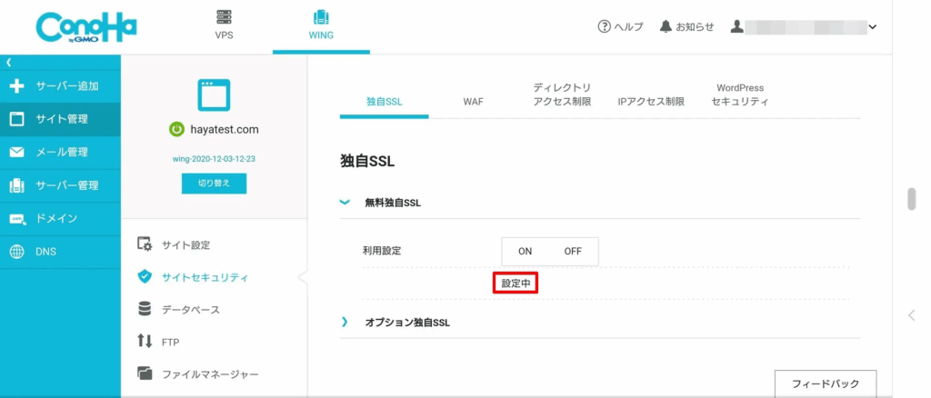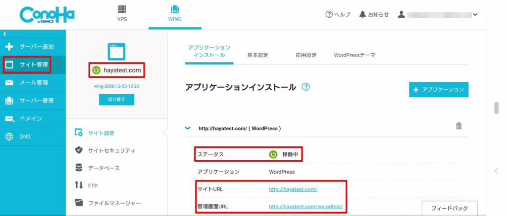 「ドメイン名:ここではhayatest.com」や「ステータス」「サイトURL」「管理画面URL」を確認することができます。