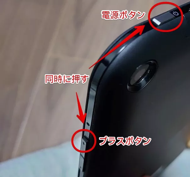 - 「電源ボタン」を押しながら「ボリュームのマイナスボタン」を10秒以上押す