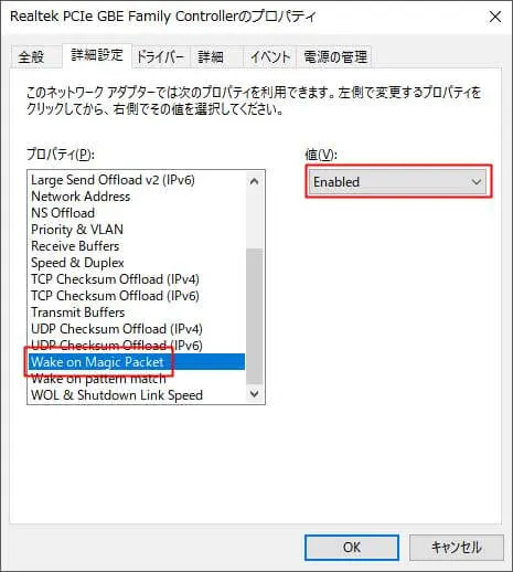 「Wake on Magic Packet」がEnabledになっているか確認します。「Disabled」になっていた場合、「Enabled」に変更してください。