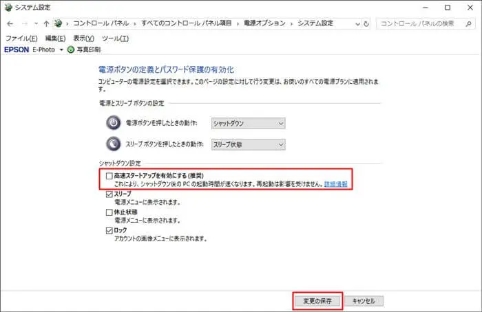 「高速スタートアップを有効にする(推奨)」のチェックを外し、「変更の保存」をクリックしWindows側の設定は完了です。