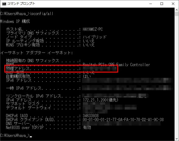 これはコマンドプロンプトで「ipconfig /all」と打つことで確認できます。